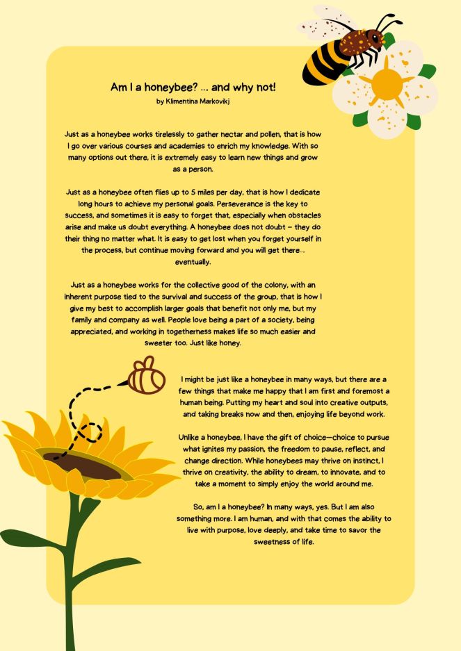 So, am I a honeybee? In many ways, yes. But I am also something more. I am human, and with that comes the ability to live with purpose, love deeply, and take time to savour the sweetness of life.